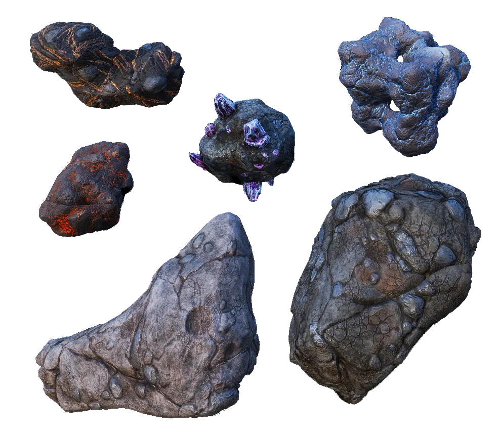 Asteroids can be found around planets and the Howling Mine. Pay attention to the asteroid's appearance, as different types contain different materials. Arrows will be visible above any minable asteroids. Use the mining laser to destroy the asteroids and obtain the different minerals. When you successfully destroy the asteroid, the minerals will automatically end up in your inventory.